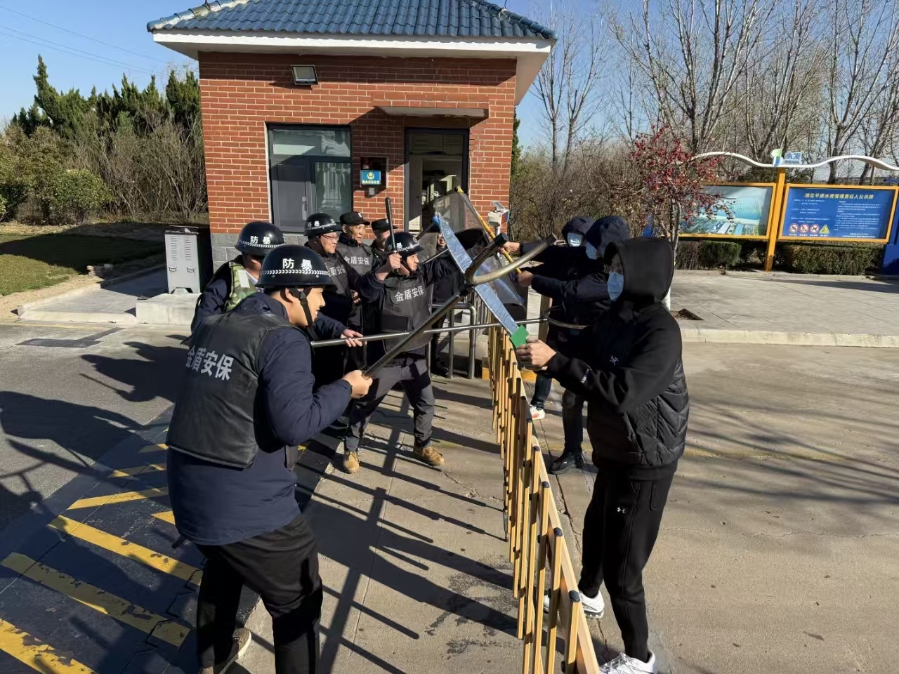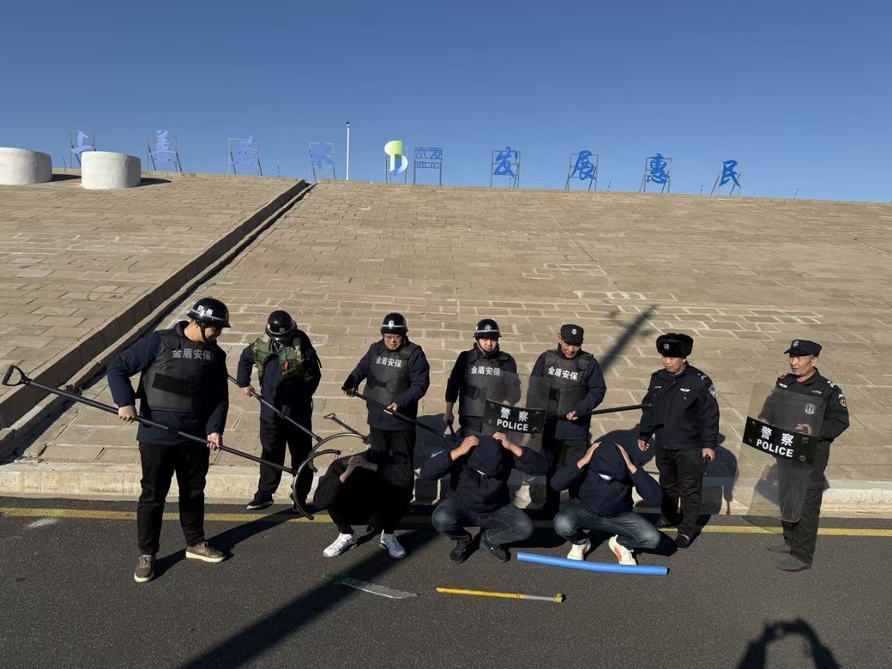 本次演練模擬了三名恐怖嫌疑人攜帶管制刀具強(qiáng)行闖入第一平原水庫、惠澤水廠加藥間,企圖破壞水庫防汛設(shè)施、投毒并實(shí)施暴力活動的場景。值班人員發(fā)現(xiàn)可疑人員后,立即上報公司領(lǐng)導(dǎo),同時啟動應(yīng)急預(yù)案,并攜帶防刺服、盾牌、鋼叉等防暴裝備趕往現(xiàn)場,對嫌疑人實(shí)施圍捕。經(jīng)過一番激烈搏斗,最終成功制服嫌疑人。